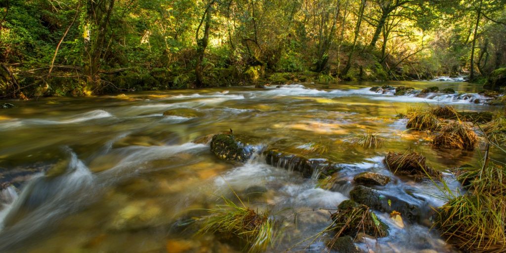 En las márgenes del río Caima, aprovechando la confluencia de varios afluentes se extiende, por varios kilómetros, un bosque mixto con especies arbóreas caducifolias y perennifolias. Aquí predominan el roble común, el castaño, el cerezo, el laurel, el acebo, el avellano, el alcornoque, el árbol de Santa María y el madroño. La flora que aquí podemos observar cuenta con el androsemo, el azul-nítido, la palominera, el sello de Salomón y la primavera. La avifauna es abundante y el colorido camachuelo se puede escuchar y, a veces, ver entre el follaje. Más cerca del río la salamandra rabilarga prospera y el martín pescador se alimenta de pequeños peces. Esta es una tierra de setas, con la sabrosa chantarela surcando la tierra negra de los bosques húmedos.