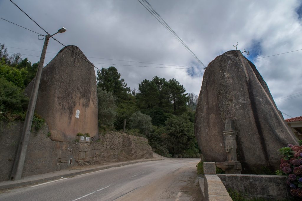 El nombre de esta localidad (Talhadas) tiene origen en los dos monolitos que se encuentran ladeando la EN333, y su denominación se remonta como mínimo al año de 1527, momento en el cual este lugar se ha inscrito en el registro como “Piedras Talladas”. Estas piedras están envueltas en una leyenda que cuenta así: cuando se dio el general terremoto originado por la muerte de Cristo, un enorme bloque de granito rodó cuesta abajo y se rompió en dos, postrándose uno frente al otro, como hoy todavía se puede ver, posibilitando así el paso de la antigua calzada romana. Así estas piedras se han nombrado “Piedras Talladas” o también “Hermanos Unidos”.