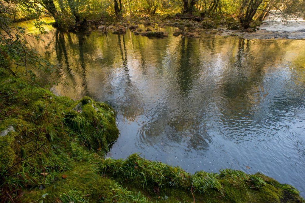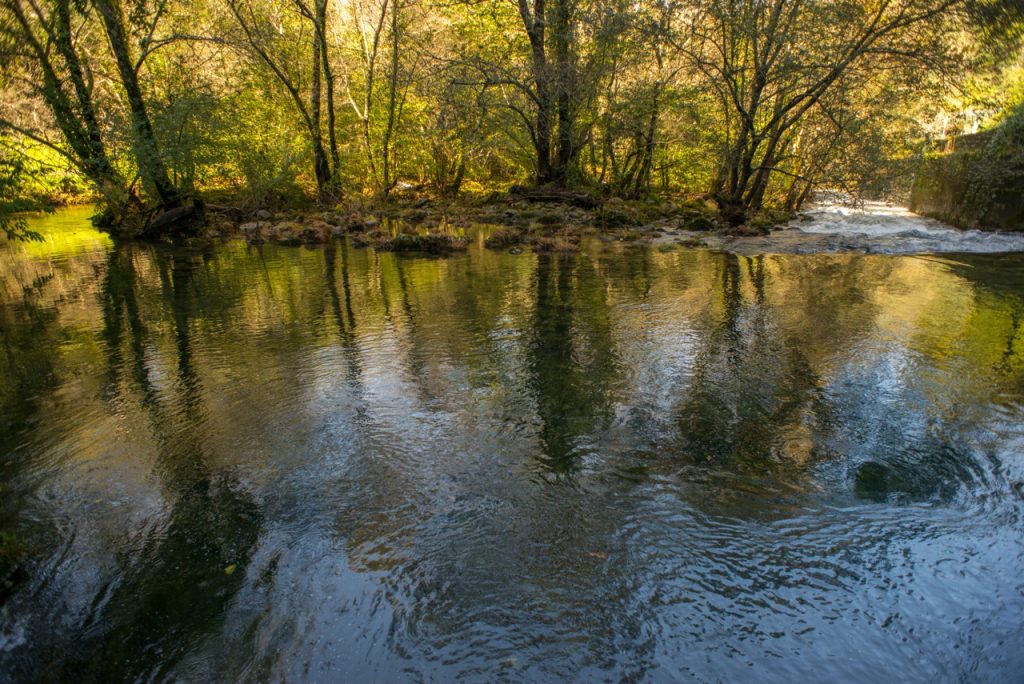 El río Caima forma aquí un bosque en galería exuberante, con alisos y sauces cabalgando las márgenes del río. La salamandra rabilarga y el lagarto verdinegro son tan abundantes que, al levantar las piedras, fácilmente encontramos estas raras especies. Junto al río, algunos acebos nos regalan su presencia; los mirtilos prosperan justo al lado de las márgenes del pozo; y el androsemo aprovecha la humedad que aquí se hace sentir. En los peñones los candeleros del diablo florecen en las grietas de la roca y, en el río, podemos observar el inquieto mirlo acuático y el colorido martín pescador, en su incesante búsqueda de alimento.