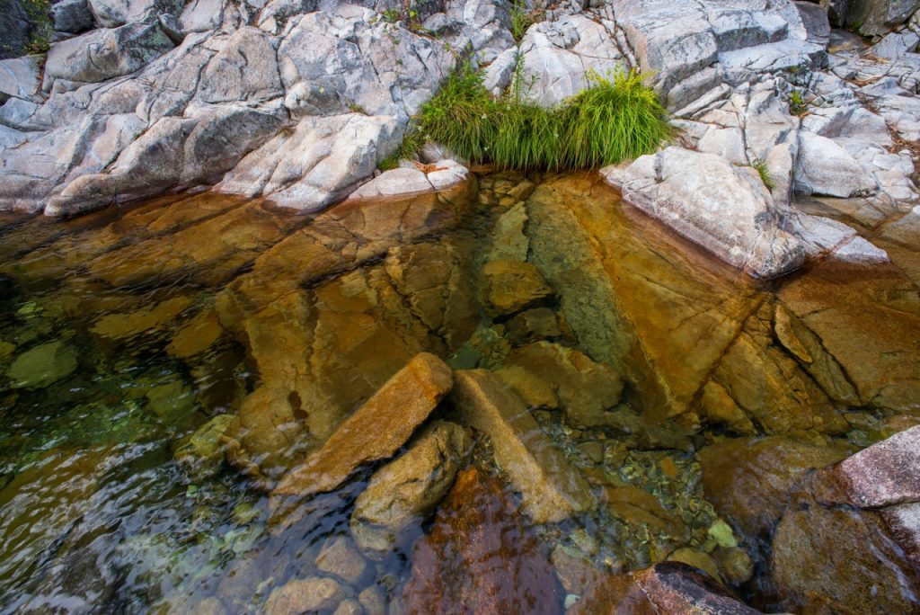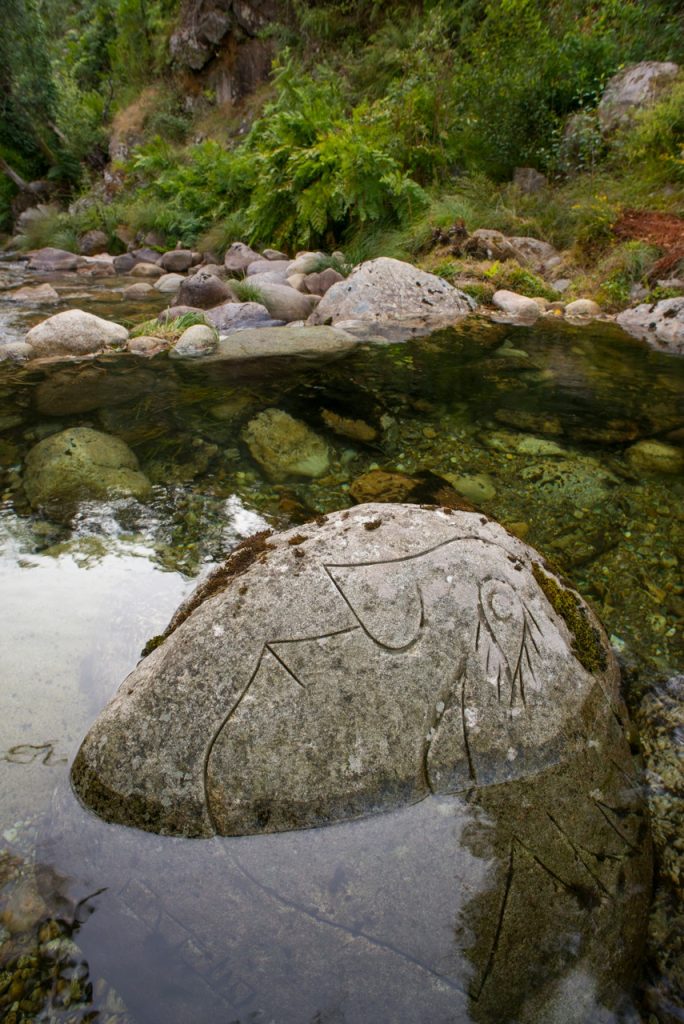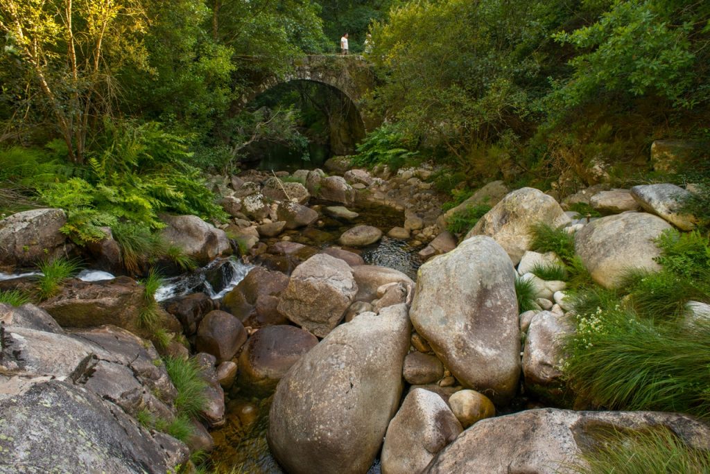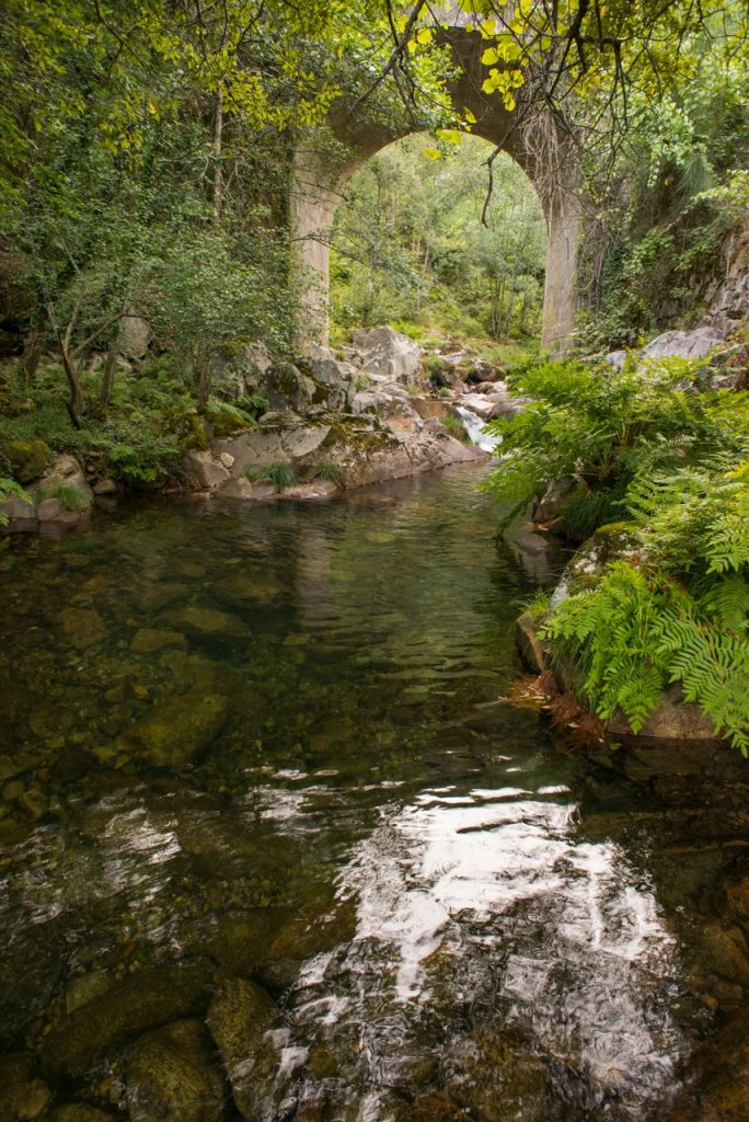 Los pozos del Puente Teixeira aprovechan las aguas cristalinas de la rivera de Landeira, que nace en las cumbres de la sierra de Arada, para crear piscinas naturales de miles de formas. El pozo Teixeira, justo debajo del puente (accesible a través del molino), el pozo de Gravuras, situado río arriba (accesible por un pequeño sendero) y los pozos Estreito y Quadrado (accesible a través del lecho del río, 200 metros río arriba desde el pozo de Gravuras) han sido caprichosamente moldeados en el macizo granítico a lo largo de muchos miles de años. Dibujos que evocan motivos humanos y naturales se han esculpido en la piedra, revelando una sorprendente armonía entre el hombre y la naturaleza en la cultura contemporánea. Los tonos rosa del granito reblandecido por la fuerza de las aguas, el verde de la vegetación pujante, el azul de las frescas aguas y el ocre y gris de los molinos y puentes se unen en este lugar para formar un cuadro de incomparable belleza.